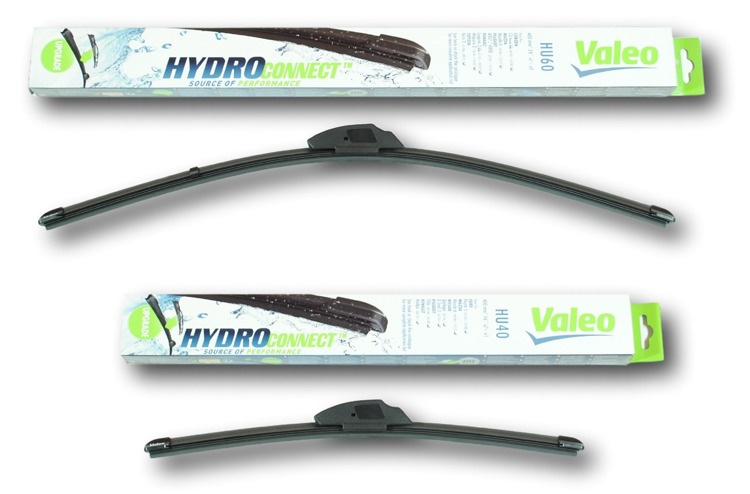 Wycieraczki Valeo HydroConnect na przednią szybę mają konstrukcję aerodynamiczną i nie posiadają klasycznych przegubów. Na całej ich długości znajduje się spojler, który ma za zadanie dociskać wycieraczkę do szyby, nawet przy dużych prędkościach. W konstrukcji wycieraczki zastosowano stalowe listwy, dzięki którym wycieraczka  dobrze przylega do szyby (regularnie rozłożona  siła  nacisku na całej długości pióra wycieraczki). Specjalny skład gumy sprawia, że doskonale spisują się one w każdych warunkach atmosferycznych; dodatkowo guma ta posiada specjalne struktury (kanaliki), które rozprowadzają płyn do spryskiwaczy po całej szybie.